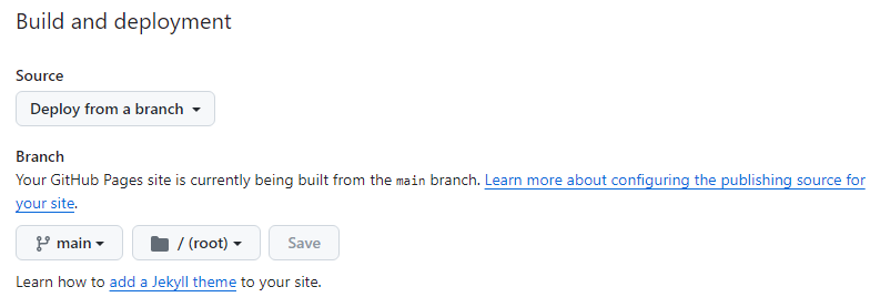 - Go to the repository settings, click on the “Pages” tab, scroll down to “Build and Deployment”, the Source would be set to